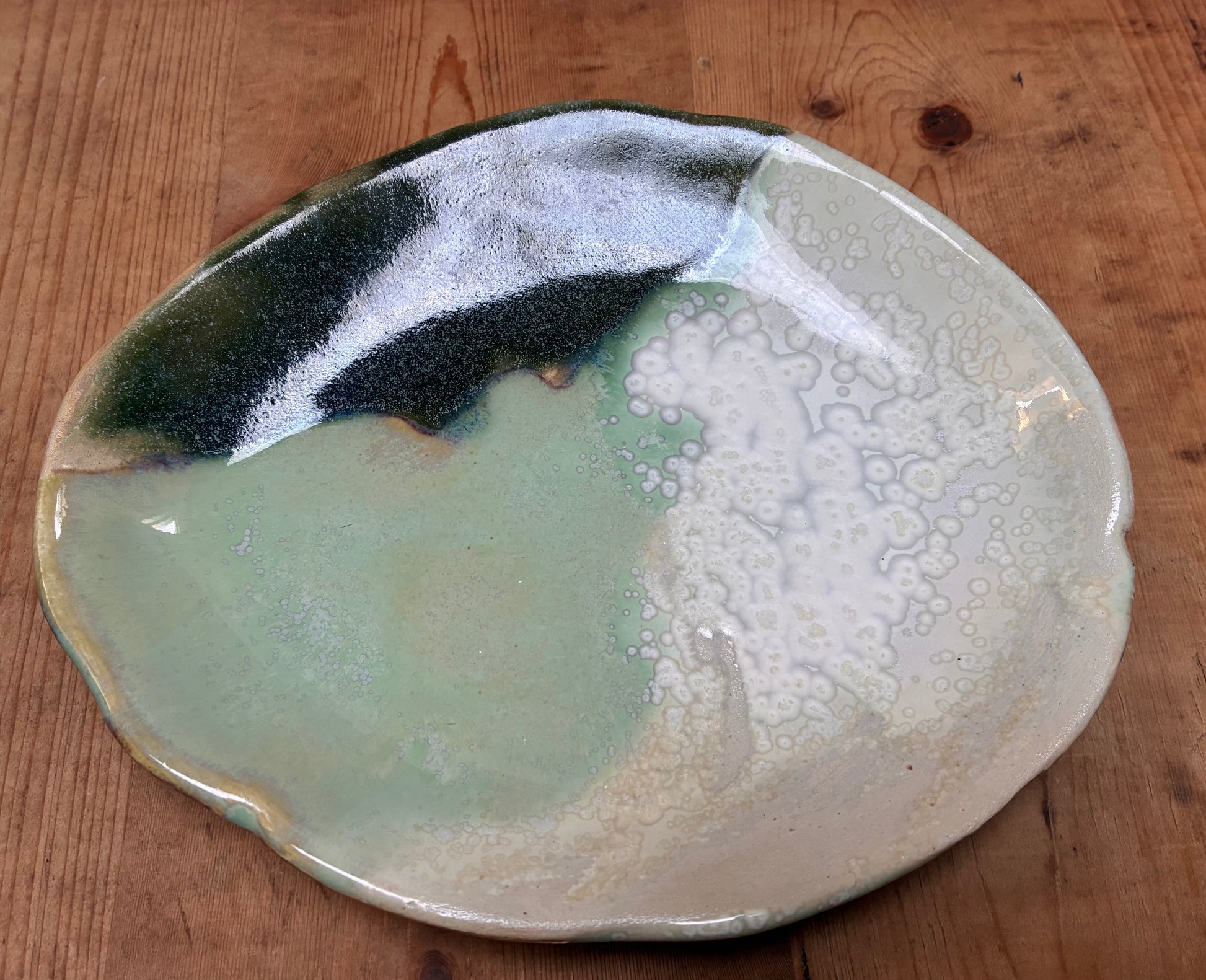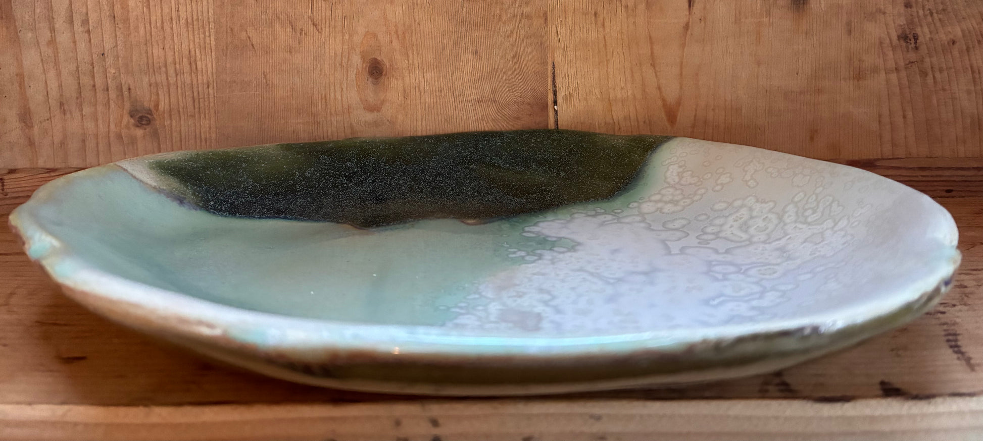 Dette unika fad i grønlige nuancer måler ca. 19,5 x 22,5 cm